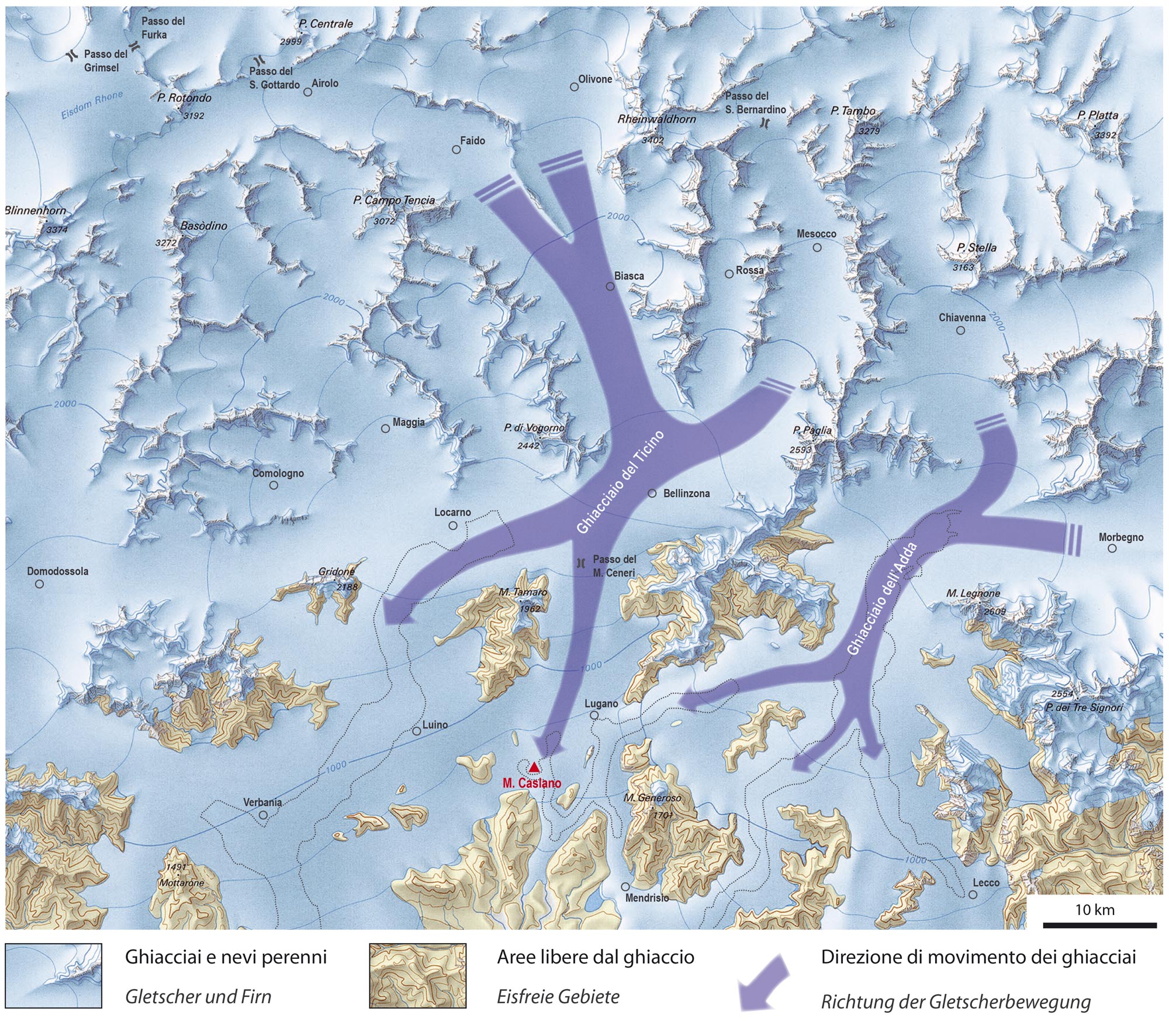 Le ultime vicende geologiche che hanno interessato il Monte Caslano sono quelle del periodo Quaternario (da 2.6 milioni di anni fa a oggi). Nel Pleistocene, la prima delle due epoche di questo periodo conclusasi 11’700 anni fa, il clima fu segnato dall’alternanza di fasi fredde e calde che determinò a più riprese l’avanzata e il ritiro dei ghiacciai alpini. Durante le fasi fredde, le lingue glaciali invasero le valli scendendo fino al margine della Pianura Padana. In tal modo, il Monte Caslano venne più volte sommerso da un ramo del Ghiacciaio del Ticino, giunto in questa regione attraverso il Passo del Monte Ceneri, e persino da un ramo del Ghiacciaio dell’Adda, proveniente dalla regione di Porlezza. Tra 27’000 e 23’000 anni fa (fase nota come Ultimo Massimo Glaciale), il Monte Caslano fu completamente ricoperto dai ghiacci per l’ultima volta. |